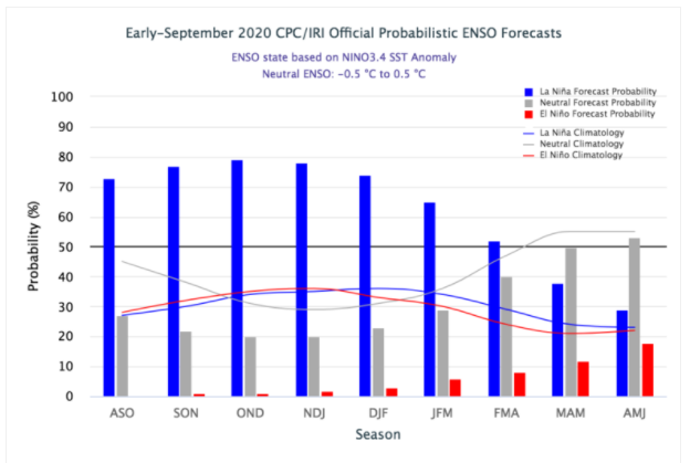 De todas maneras, si tenemos en cuenta que el último pronóstico elaborado por Climate Prediction Center e International Research Institute for Climate and Society (CPC/IRI) indica que existe un 79% de probabilidad de ocurrencia de un evento “Niña” en el último trimestre de 2020, es conveniente ser prudente al momento de definir densidades de maíz en la presente campaña 2020/21.