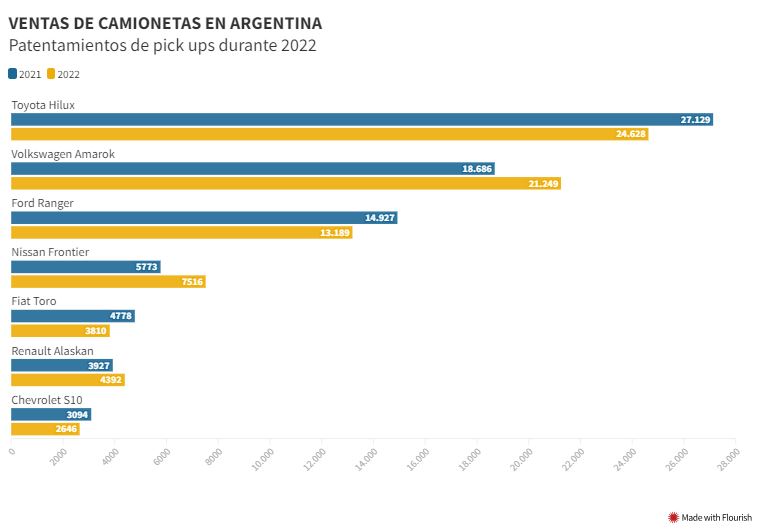 Un total de 77.430 pick ups cero kilómetro se comercializaron a lo largo de 2022 en Argentina, lo que representa una leve caída del 1,1% en relación a las 78.314 del ejercicio anterior.