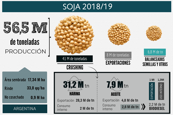 El total estimado para la campaña 18/19 es de 41 millones de toneladas de soja industrializada. El producto de esta industrialización se divide en expellers y harina de soja de extracción, ambos subproductos se derivan de dos métodos de producción diferentes, por prensa y por solvente respectivamente (cuando se habla de harina de soja, muchas veces se refiere a ambos subproductos. Al número de harina de extracción se adiciona también los pellets de cáscara soja).