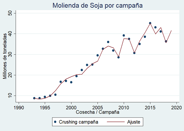Para la campaña 18/19, se espera que se recupere la molienda de soja en Argentina debido a la mayor producción de la oleaginosa a nivel local, que se estima en 56,5 millones de toneladas (Mt), marcando un aumento sustancial desde los 35 Mt de la campaña 17/18. Aun así el número de molienda estaría por debajo de campañas con producciones similares.