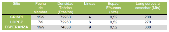 En floración se realizó una evaluación de plantas logradas por híbrido. En los recuentos se observó que los valores difirieron significativamente de los objetivos planteados a la siembra, especialmente en el sitio de López (cuadro 3).
