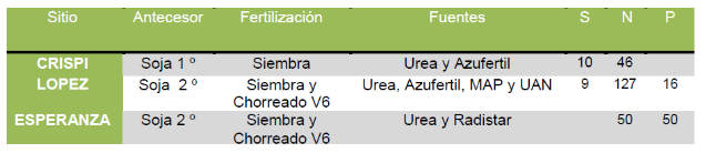 Cuadro 2. Fertilización en ensayos de maíz de siembra temprana según sitio. Santa Fe Centro (2018/19)