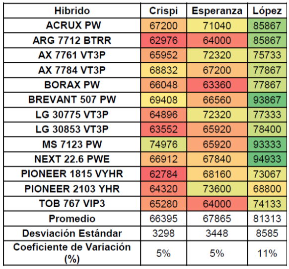 Los rendimientos más altos se obtuvieron en el sitio Esperanza, con diferencias estadísticamente significativas entre las localidades. El sitio de López, a pesar de ser el ambiente de mayor calidad de los tres, presentó el rendimiento promedio más bajo y de mayor variabilidad, pudiéndose explicar en parte por los desajustes en densidad de siembra evidenciados.