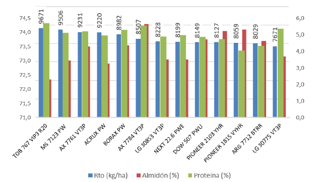 En López el híbrido Tobin 767 fue el que obtuvo el mayor rendimiento. La diferencia entre el mayor y menor rendimiento fue de 1997 kg/ha. El 35% de los híbridos estuvo por encima de la media (Tobin 767 Vip3, MS 7123, AX 7784 VT3P, Acrux y Borax).
