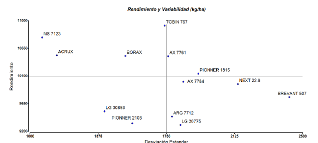 La desviación estándar puede tomarse como una medida de la estabilidad de los resultados obtenidos. En el grafico 2 se observan en el cuadrante superior izquierdo los híbridos que presentaron el mayor rendimiento y la menor variabilidad, considerando los resultados de los tres sitios en conjunto en 2018/19.