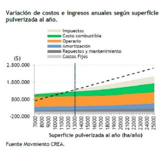 La “superficie de indiferencia” que es necesaria trabajar para que una pulverizadora propia sea rentable es de un mínimo de 13.000 hectáreas anuales. “Por encima de esta superficie los ingresos superan a los costos y el margen neto se vuelve positivo”, indica el último Informe Microeconómico publicado por CREA.