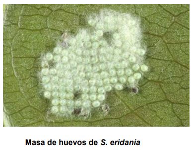 Las larvas generalmente se encuentran en la superficie inferior de las hojas y son más activas por la noche. La duración de la etapa larval es normalmente de 14 a 20 días (Capinera, 2011) a partir del cual se transforman en pupas en el suelo, por lo general a una profundidad de 5-10 cm. Las pupas son de color marrón y miden aproximadamente 16 a 18 mm de longitud y de 5 a 6 mm de ancho, teniendo el período pupal una duración de 11 a 13 días (Montezano et al., 2014). Si bien son fundamentalmente defoliadoras, una oruga de S. eridania puede llegar a dañar hasta 1,7 pimpollos durante su desenvolvimiento, pero no se pudo constatar daño en las cápsulas (Santos et al., 2010)
