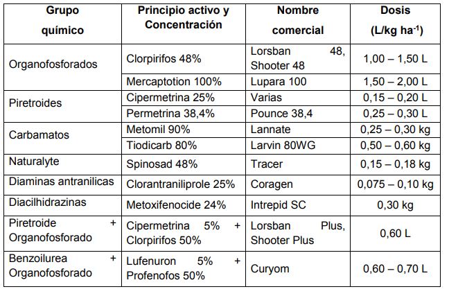 Existe un amplio listado de productos químicos autorizados para el control de este género en el cultivo de maíz. Estos mismos productos también se usan en algodón, pero para el control de otros lepidópteros, por lo que se debe tener cuidado al momento de realizar recomendaciones, ya que no están autorizados para el control de Spodopteras. Un último comentario es para S. cosmioides. A pesar de que en los marbetes de los productos químicos ni siquiera figura como especie, se sabe que es más tolerante a las dosis convencionales de otras orugas. En Brasil hay datos de que solo se pueden lograr controles satisfactorios con el doble o más de dosis que para las otras Spodopteras (Igarzábal y Gálvez, 2014).