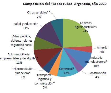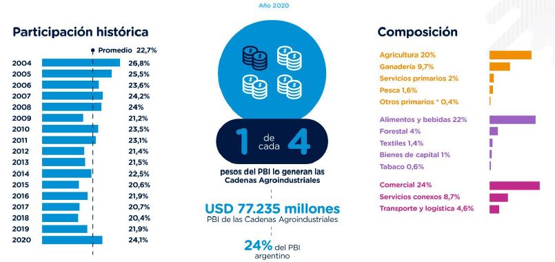 En el año 2020, las cadenas agroindustriales representaron el 24% del PBI argentino la principal actividad económica.