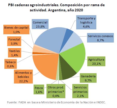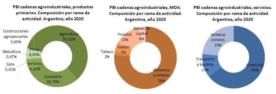 Dentro de la composición del PBI de las cadenas agroindustriales se destaca, como las principales ramas de actividad que aportan al mismo, la actividad comercial con el 23,8% la producción de alimentos y bebidas con un 22,2% agricultura con 20,1% ganadería 9,7% y servicios conexos 8,7% En su conjunto estas cinco actividades explican el 84% del PBI de las CAI.