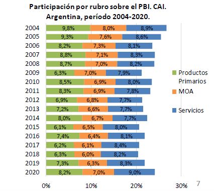 Mientras que, en el caso de los servicios conexos, se consideran en base al porcentaje que explican la producción de bienes (productos primarios y MOA) de las cadenas agroindustriales, sobre el total del PBI nacional. En este último caso, si el PBI de bienes
