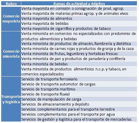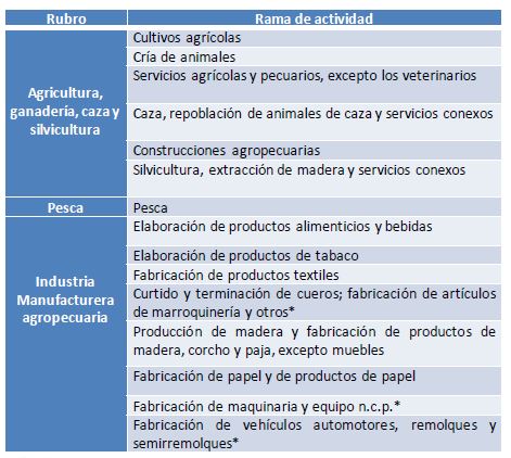 cuero, los cuales son ajustados en base a la proporción de empleo vinculado con estos rubros dentro de las cadenas agroindustriales En el cuadro adjunto se detallan las ramas de actividad que incluyen “agricultura, ganadería, caza y silvicultura” y las consideradas dentro de “industria manufacturera” como parte de las cadenas agroindustriales.