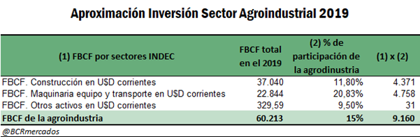 En la metodología de Valverde (2018) se aplica una participación de la inversión del sector agricultura y pesca, al 9,5 % del total de la inversión en maquinarias y equipos y un 6,8 % de la inversión en construcción no residencial. Como se considera que la agroindustria abarca sectores manufactureros, de transporte y de comercio adicionales, en base a las participaciones de las actividades incluidas en Coremberg (2018), se aproxima la participación de la agroindustria en la inversión de maquinarias y transporte en el orden del 20,8 % y del 11,8 % de la construcción total. Aplicando estas participaciones a los datos brutos del INDEC, sumados a la inversión en otros activos, se arriba a una inversión total del sector del orden de los 9.160 millones de dólares en el año 2019.