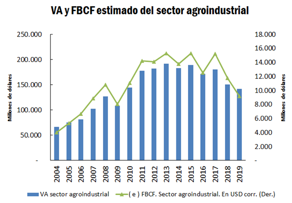 Este valor se trata de una aproximación puntual a la inversión realizada por el sector agroindustrial en el año 2019. Si tomamos el método de aproximación descrito en el párrafo anterior, se puede aproximar la inversión del sector agroindustrial para el período 2004-2019. Para una estimación más precisa se debería replicar la metodología de Valverde (2018) utilizando y agregando los sectores desde las fuentes de información primarias que componen el sector agroindustrial y calcularlos para todo el período determinado.
