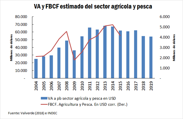En la literatura reciente se encuentran dos trabajos en donde se calcula la FCBF por diferentes sectores. Uno elaborado por Coremberg (2009) realizado en el marco del proyecto ARG ARKLEMS y el trabajo de Valverde (2018) realizado en el marco del proyecto LA-KLEMS coordinado por CEPAL y financiado por el BID. En el trabajo más reciente, el que se utilizó como base, Valverde (2018) calcula la FBCF del sector agrícola y pesca en base a diferentes datos sectoriales: los Informes Sectoriales de Maquinaria Agrícola del INDEC, los Informe de la Industria de Maquinaria Agrícola del INDEC, el Informe del Sector de Maquinaria Agrícola de la Provincia de Santa Fe, cuadros de oferta – utilización del INDEC, Presupuesto de la Administración Nacional – Gastos por finalidad, función y naturaleza económica y Cuentas Ahorro – Inversión en base devengado del Ministerio de Hacienda. El valor del mismo se encuentra presentado en el gráfico adjunto acompañado de la evolución del valor agregado del sector agrícola, todo medido en dólares estadounidenses corrientes.