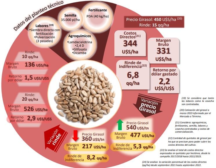 A continuación se analizan los costos e ingresos esperados para el cultivo de girasol en el Sudoeste Bonaerense Semiárido, considerando un planteo de siembra directa. Para el cálculo de los resultados económicos se consideró el valor a marzo 2023 establecido por MATba (450 U$S/tn), y se utilizaron los precios de labores e insumos relevados a nivel regional (septiembre 2022, sin IVA).