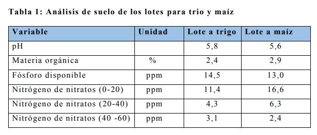 Ambos lotes presentaron resultados diferentes. El que se destinó a maíz tuvo una reacción del suelo ligeramente más ácida, un contenido de materia orgánica superior, ambos presentaron un contenido de fósforo medio y en cuanto a nitrógeno, el lote a maíz, tuvo una mejor provisión inicial. Sobre estos puntos se debe aclarar que los muestreos de suelo fueron realizados en épocas diferentes del año, el de trigo a fines de mayo y el de maíz a principio de septiembre.