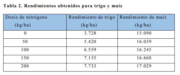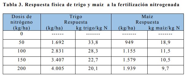 Los resultados obtenidos en cada experiencia son diferentes. En el caso de trigo hay una respuesta muy importante, aun en las dosis de nitrógeno más elevadas. Para maíz, si bien la respuesta siempre existió a medida que la dosis de nitrógeno aumento, las respuestas (kg de grano/kg de nitrógeno aplicado), fueron más modestas. Tabla 3.