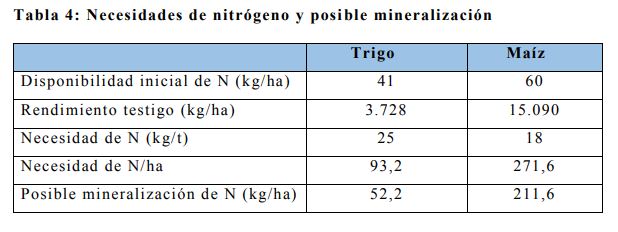 Esto lo podríamos observar en los rendimientos de los tratamientos testigos, tanto en trigo cómo en maíz. En el caso de trigo partimos, de acuerdo al análisis hasta 60 cm de profundidad, con una disponibi lidad de nitrógeno de 41 kg/ha, en tanto que en maíz con 60 kg/ha. Las necesidades nutricionales de ambos cultivos son diferentes y pueden variar dentro de un rango amplio, en el caso de trigo se considera que esa necesidad se ubica entre 25 – 30 kg de nitrógeno por tonelada de grano producido, en tanto que para maíz la misma varía entre 18 a 25. Considerando lo expuesto y trabajando con los menores valores encontramos los probables valores de mineralización. Tabla 4