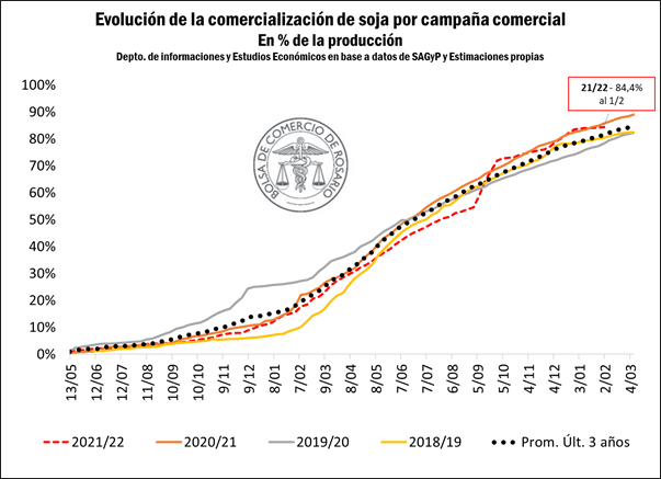 Nota N°1: Panorama comercial de la soja 2021/22: la comercialización avanzó sobre el 84,4% de la producción. Se estima un remanente de 5,2 millones de toneladas por comercializar