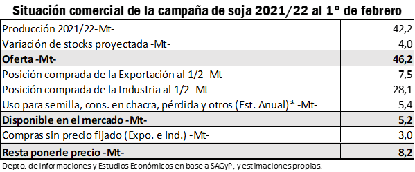 Al 1° de febrero, el remanente de soja sin vender en el mercado doméstico se ubicaría en torno a 5,2 millones de toneladas. Esto se compone de una producción de 42,2 millones de toneladas (estimación GEA-BCR), a la que se le suman 4 millones de toneladas que se proyectan en variación de stocks entre campañas, y se le restan los 35,6 millones de toneladas que ya tiene compradas el sector industrial y exportador. A su vez, se le restan 5,4 millones de toneladas que no entrarían al circuito comercial, que corresponden a pérdidas, uso para semillas y consumo para extrusado no censado.