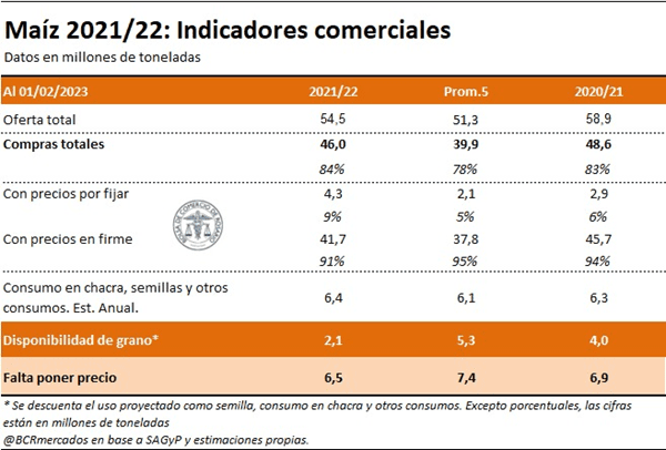 Analizando el balance comercial del maíz 2021/22 al 1° de febrero, quedan teóricamente en el mercado unos 2,1 millones de toneladas de maíz disponible para la comercialización, sobre una oferta total inicial de 54,5 millones de toneladas (producción más stocks iniciales). En este cálculo hemos descontado el uso proyectado en semilla, consumo en chacra y otros consumos. Esta cifra de 2,1 Mt representa 1,9 millones de toneladas menos de lo disponible a la misma fecha de la campaña 2020/21, y 3,2 millones de toneladas por detrás del promedio del último lustro. Es necesario considerar que parte de este universo remanente pasará con suma probabilidad a componer stocks iniciales de la campaña próxima
