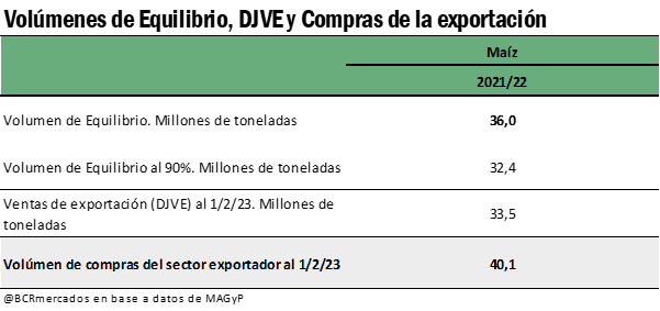 Sobre estos 44,6 millones de toneladas ya comercializadas de la campaña 2021/22, la exportación tiene aseguradas 40,1 millones de toneladas. Este total es mayor a los 36 millones de toneladas del Volumen de Equilibrio fijado por las autoridades nacionales, a la vez que excede las 33,5 millones de toneladas declaradas en ventas al exterior (DJVE) a la fecha. Considerando que en la Resolución 182/2022 se estableció una prórroga de hasta 180 días para las ventas declaradas con fechas de embarque entre diciembre 2022 y febrero 2023, no se considera probable la extensión del volumen de exportación permitido por las autoridades.