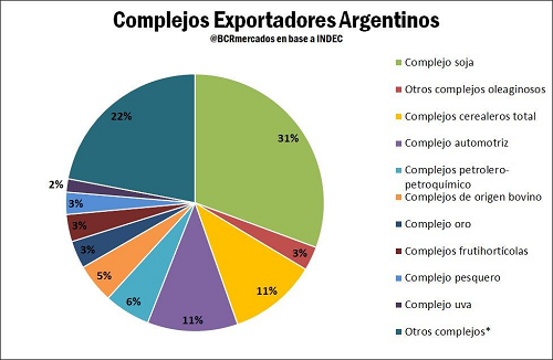 En efecto, el complejo soja en Argentina ha sido el principal rubro de exportación y de generación de divisas en la Argentina en los últimos años. En el pasado reciente, los despachos de poroto de soja y sus productos derivados, incluyendo pellet, expeller, aceite, biodiesel, glicerina, lecitina, entre otros, representaron en promedio el 30% de las ventas exentas externas totales de nuestro país, constituyéndose en el principal complejo exportador de la economía nacional.