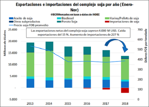 A raíz de ello, se comprende que en la actual campaña 2017/18 una combinación de factores, que incluyeron la feroz sequía que recortó en 20 millones de toneladas la producción y la caída en la rentabilidad de la industria aceitera exportadora, se combinaron para recortar en parte el procesamiento de soja en Argentina y las exportaciones de poroto de soja y con ello, el ingreso de divisas en concepto de exportaciones de la cadena. El valor de las exportaciones cayó un 15% respecto al año anterior en el período enero-noviembre (casi 2.500 millones de dólares). El porcentaje podría recortarse a partir del impulso de los embarques de poroto a China en el mes de diciembre. Por otro lado, la necesidad de inventarios de las plantas industriales generó un aumento de las importaciones de soja del 227 % comparado con igual período del año pasado. De esta manera, en el período ene-nov de 2018 las exportaciones netas del complejo soja cayeron 4.000 millones de dólares.