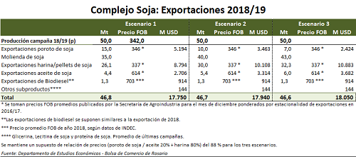 El Escenario 3 conlleva una situación ideal de 43 Mt de molienda de soja local, y 7 Mt de exportación de poroto de soja, privilegiando el agregado de valor dentro de las fronteras argentinas. En este escenario, se exportaría una cantidad similar en toneladas al planteado en el escenario dos, pero al despacharse productos más elaborados el valor de las exportaciones alcanzaría los US$ 18.050 millones, siendo el que mayor ingreso de divisas reporta a la economía argentina. Vale aclarar que en los tres escenarios se supusieron exportaciones de biodiesel constantes, dado que las mismas, como se ha dicho, depende más del devenir de las negociaciones políticas multilaterales que de la producción de soja. A su vez, se mantuvo un supuesto conservador de la relación de precios entre poroto de soja y subproductos del 88 %, similar al de los años 2016, 2017 y 2018. En base a los 3 escenarios previstos en la campaña 18/19 podrían entrar al país divisas por entre 17.750 y US$ 18.050 millones. En comparación, la mejor cosecha de soja podría incrementaría sustancialmente los ingresos de divisas en el año 2019 respecto del año anterior generando un aporte clave ante las necesidades financieras de la economía argentina el próximo año.