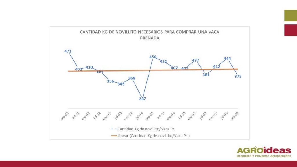 Hoy en día la categoría de vacas preñadas es la categoría que menos aumentó y quedó claramente retrasada en su valor de mercado. Frente al incremento de alrededor del 25% que ocurrió en el ganado para consumo en lo que va de 2019, al momento de vender esta categoría la capacidad de compra de vientres es superior a la observada en los últimos años. Hoy necesitamos menos kilos de novillito que el promedio de los últimos ocho años para adquirir un vientre preñado.