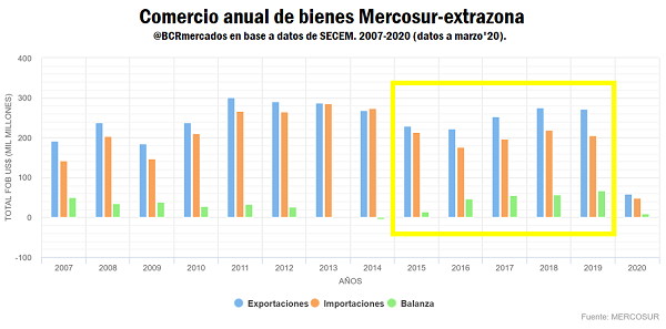 En 2019, Argentina registró un superávit comercial con el Mercosur de US$ 448 millones. El bloque es el principal proveedor externo de insumos de todo tipo, maquinarias, equipos y bienes de consumo para Argentina. El año pasado las importaciones de nuestro país al bloque fueron de US$ 12.243 millones equivalentes al 25% del total y superando a otros importantes orígenes como China (19%) y la Unión Europea (18%). Por otro lado, las exportaciones argentinas al Mercosur sumaron US$ 12.691 millones; concentrando el 19,5% de las exportaciones totales.