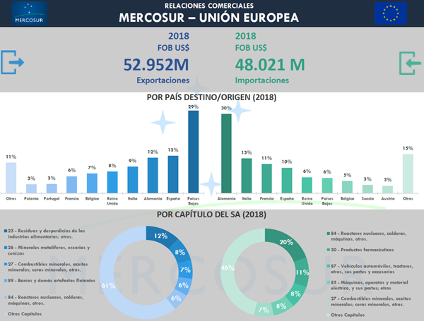 La siguiente infografía realizada por el Sistema de Estadísticas de Comercio Exterior del MERCOSUR (SECEM) para 2018 ilustra las principales características de esta relación bilateral. Surgen como principal mercado para las exportaciones del bloque sudamericano los Países Bajos (29%) que conservan una amplia ventaja sobre los siguientes mayores compradores: España (13%), Alemania (12%), Italia (9%) y Reino Unido (8%). En contrapartida, entre los principales proveedores de bienes europeos al Mercosur destaca Alemania (30%), seguido por Italia (13%), Francia (11%), España (10%) y Reino Unido (6%).