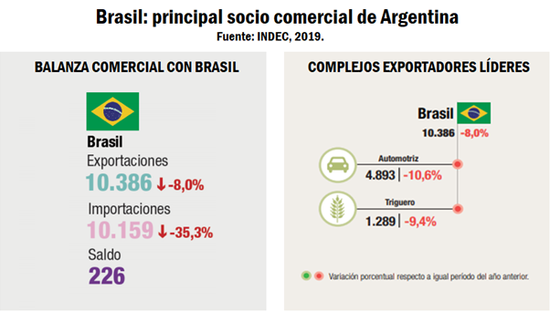 En 2019 nuestro país obtuvo un superávit comercial con Brasil de US$ 226 millones, sustentado fundamentalmente por las exportaciones del complejo automotriz y el complejo triguero que contribuyeron al 60% de los despachos argentinos a Brasil.