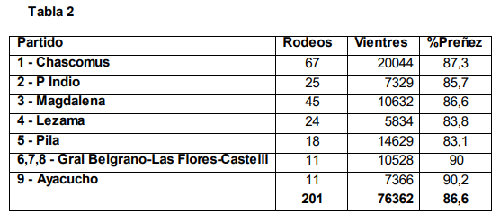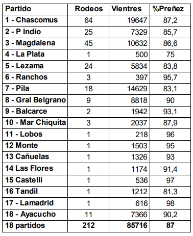 El INTA Cuenca del Salado viene realizando desde 2004 un Monitoreo de Eficiencia Reproductiva en rodeos pertenecientes a productores ganaderos privados, de Grupos Cambio Rural y CREA, con la intención de medir los índices reproductivos del área y el nivel de reservas que tienen los vientres mediante la observación de la condición corporal en períodos críticos como son tacto-destete, inicio de la parición y fin del servicio. Este informe tiene el objetivo de dar a conocer los resultados de preñez de este ciclo. Los índices descriptos en este informe pertenecen a campos de 18 partidos y los datos se obtienen en forma directa por parte de técnicos de INTA y de informes de veterinarios privados que colaboraron para tal fin. Los índices analizados pertenecen a 229 rodeos de vacas y vaquillonas de 189 campos de 18 partidos (12 pertenecientes a la Cuenca del Salado) obtenidos de los diagnósticos realizados por 11 veterinarios privados que colaboraron para tal fin.