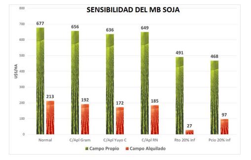 Vemos que en campo alquilado, la merma de precio afecta más que la de rendimiento, pero sin embargo, una combinación de merma de rendimientos y mayores costos de protección, afectarían sensiblemente los márgenes potenciales de campos en alquiler.