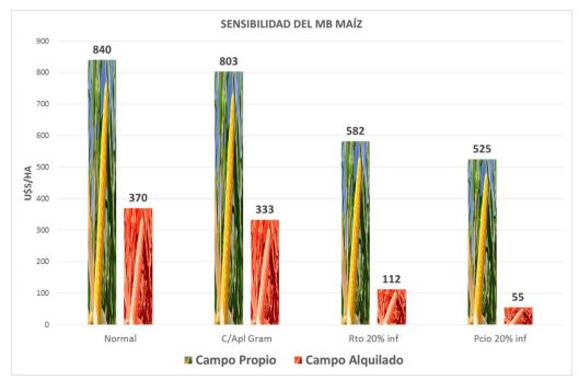 Si hacemos la misma simulación para un maíz con potencial de rendimiento de 100 qq/ha, considerando que son las gramíneas resistentes las que mayores problemas causan a este cultivo, tenemos los siguientes márgenes, en campo propio y alquilado, considerando también el costo de alquiler de 16 qq/ha de soja, y un recorte de rendimiento del 20% y del precio del 20%.