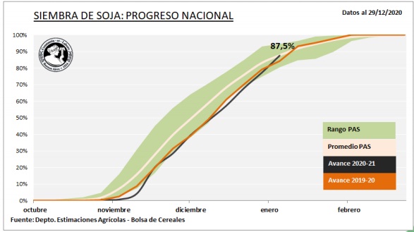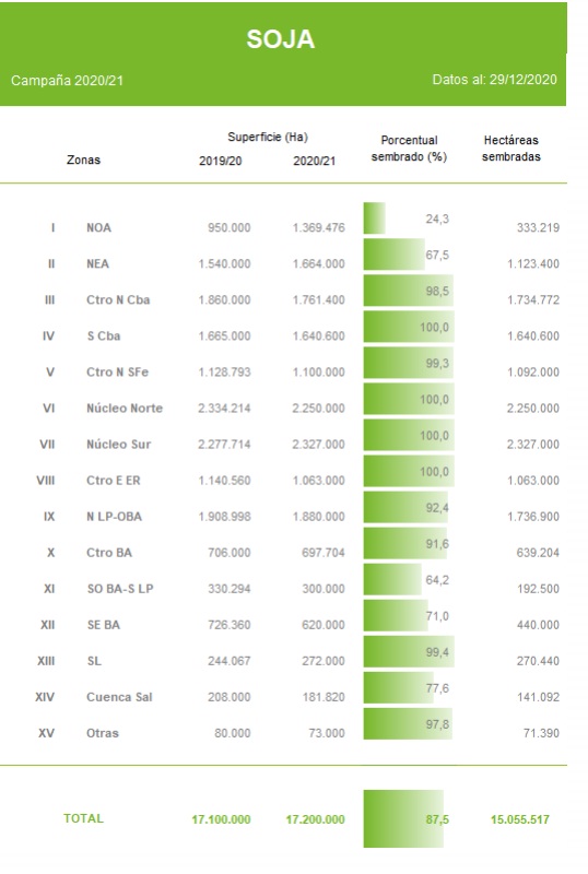 La siembra cubre el 87,5% de las 17,2 MHa proyectadas para la campaña 2020/21, informando una demora de -2,1 puntos. Restan por incorporar 2,1 MHa.
