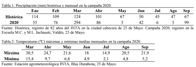 Se registraron las precipitaciones (Tabla 1) y las temperaturas máximas y mínimas durante el ciclo del cultivo (Tabla 2).