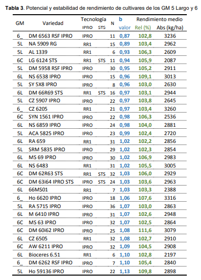 A su vez, los ensayos con rendimientos entre 10 y 8 qq/ha se registraron en su totalidad, durante el ciclo agrícola 2017/18: el GM 5L en Paraná, fechas temprana y tardía; los GMs 4C, 4L, 5C y 7L_8 en Villa Mantero; y los GMs 5C y 6 en San Salvador. Los resultados se presentan en cuatro tablas, según gran grupo de madurez: cultivares muy precoces, precoces, de ciclo intermedio y de ciclo largo para la latitud de Paraná (Tablas 1 a 4, respectivamente). Se incluyen a todos los cultivares de alto potencial, con rendimiento relativo > 102%, ordenados por índice de estabilidad “b” creciente. Complementariamente, se agrega, para cada cultivar, su GM de origen en los ensayos RECSO; su denominación, y la tecnología que poseen (RR1 o RG: sojas con el evento genético 40-3-2 con tolerancia a glifosato; INTACTA RR2 PRO: sojas con los eventos MON87701 X MON89788, con tolerancia al herbicida glifosato y resistencia a lepidópteros, y sojas STS con resistencia a sulfonilureas).