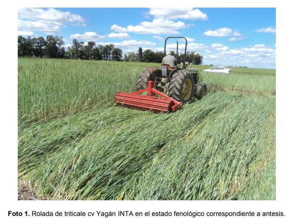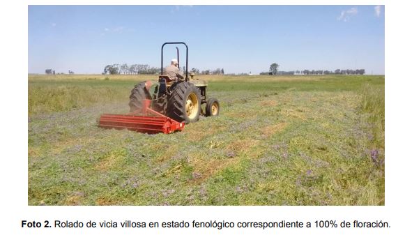 Desde el año 2013 se lleva a cabo un experimento en el campo experimental de la EEA INTA Marcos Juárez (Córdoba, Argentina), sobre un suelo Argiudol típico, capacidad de uso (I) (INTA, 1978). El mismo es una secuencia de cultivos soja – maíz bajo siembra directa, en la cual el antecesor de la soja es triticale (T) mientras que la vicia villosa (V) es el antecesor de maíz, a su vez esta misma secuencia soja – maíz se realiza sin CC. El diseño experimental es en bloques completos aleatorizados con arreglo en parcela dividida con tres repeticiones. La parcela principal son T o V como CC y un testigo sin CC denominado barbecho (B), y la parcela secundaria dos manejos de malezas, con control adicional con herbicidas en postemergencia (CPOS) y sin control adicional con herbicidas en postemergencia (SPOS) en soja y maíz. Los CC se sembraron sin fertilizar, en los meses de Mayo – Junio, con una densidad de 150 plantas m-2 en triticale y 25 plantas m-2 en vicia villosa, con una distancia entre surcos de 17,5 cm. Se determinó materia seca de los CC (kg ha-1 ) al momento de secado (Método mecánico “rolado”), el que se realizó en los meses de Octubre – Noviembre dependiendo de las condiciones de cada campaña (fotos 1 y 2). El rolo utilizado en este experimento es de la marca JLS, con un ancho de labor de 2 m y un diámetro de 0,5 m. Posee cuchillas dispuestas en forma recta (sin filo) y un peso lleno con agua de 880 kg. Posterior al rolado del triticale se sembró la soja (campaña 2013/2014 y 2015/2016) y posterior al rolado de vicia villosa se sembró maíz (campaña 2014/2015 y 2016/2017) incluyendo además al barbecho sin CC.