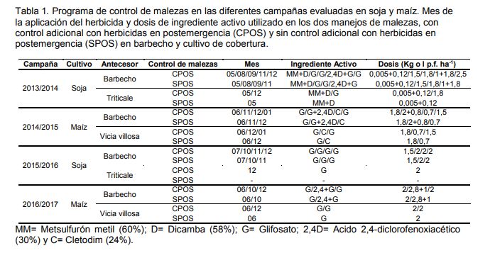 El objetivo del estudio fue determinar el efecto de la utilización de CC y dos programas de control de malezas en la productividad y el impacto ambiental en una rotación soja/maíz.