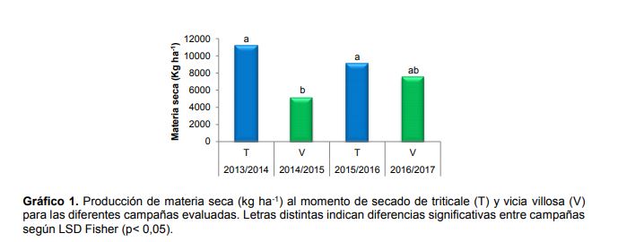 El nivel de producción de materia seca al momento de secado vario significativamente (p<0,05) entre especies (Gráfico 1). La materia seca promedio de T y V fue de 10158 y 6377 kg ha-1 respectivamente. Trabajos realizados con triticale como CC en la región sudeste de la provincia de Córdoba en suelos Arguidoles típicos, mostraron que la producción de MS es variable según el año y manejo aplicado. Por ejemplo en años con un adecuado perfil de humedad (entre 80 y 100% de la capacidad de campo) y aplicación de 100 kg N ha-1 en forma de UREA se alcanzaron producciones de materia seca de 15940 kg ha-1 (Bertolla et al., 2012), mientras que en años con contenidos de humedad (inferiores al 50% de capacidad de campo) a la siembra se lograron producciones de 5560 kg ha-1 (Baigorria & Cazorla, 2010). Dentro de las leguminosas, vicia villosa es una especie con buen comportamiento a las bajas temperaturas, aporte de N y control de malezas (Ebelhar et al., 1984; Clark et al., 1995; Renzi et al., 2008; Vanzolini et al., 2012), con producciones de materia seca que van de los 3000 a 8000 kg ha-1 (Capurro et al., 2012; Rillo et al., 2012; Baigorria et al., 2011; Vanzolini et al., 2012). Estos datos, muestran que el manejo y los ambientes influyen en la producción de MS del CC (gramíneas y leguminosas), lo cual puede producir diferentes resultados en el grado de supresión de las malezas según la situación de análisis.