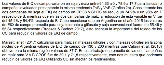 La gran adopción que tiene la siembra directa y la utilización de cultivares de soja resistentes a glifosato, generó que el sistema productivo sea cada vez más dependiente de la utilización de herbicidas de amplio espectro como el glifosato. Así, en los últimos 10 años se ha verificado un incremento significativo en las dosis y frecuencias de aplicaciones de herbicidas en los sistemas agrícolas y mixtos. La principal causa de esto puede correlacionarse con la aparición de tolerancia y resistencia de ciertas malezas al glifosato (Rainero, 2008).El incremento en los costos de los herbicidas, sumado a las cuestiones ambientales, impulsa la necesidad de encontrar alternativas que reduzcan el uso de los mismos. Para aumentar la sostenibilidad de las estrategias de manejo de malezas, el proceso de toma de decisiones debe incorporar una evaluación del impacto ambiental (Stewart et al., 2011). El coeficiente de impacto ambiental EIQ (sigla en inglés) puede ser usado para comparar diferentes plaguicidas o bien diferentes programas de manejo de las malezas de forma de obtener que programa o herbicida presenta un menor impacto ambiental. Los CC representan una práctica con potencial para, entre otros objetivos, reducir el uso de herbicidas y disminuir a su vez el impacto sobre el medio ambiente. El objetivo del estudio fue determinar el efecto de la utilización de CC y dos programas de control de malezas en la productividad y el impacto ambiental en una rotación soja/maíz.