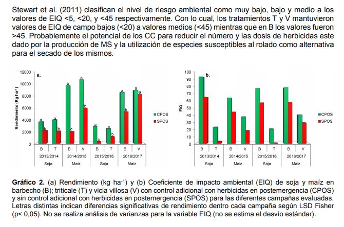 La utilización de CC y el rolado de los mismos, permiten reducir significativamente las dosis y el número de aplicaciones de herbicidas minimizando de esta manera el impacto sobre el medio ambiente, sin afectar el rendimiento de los cultivos de soja y maíz. Este sistema permitiría un uso más sustentable de los recursos naturales y además sería una opción promisoria en áreas con restricciones en la aplicación de herbicidas (agricultura orgánica y zonas periurbanas).