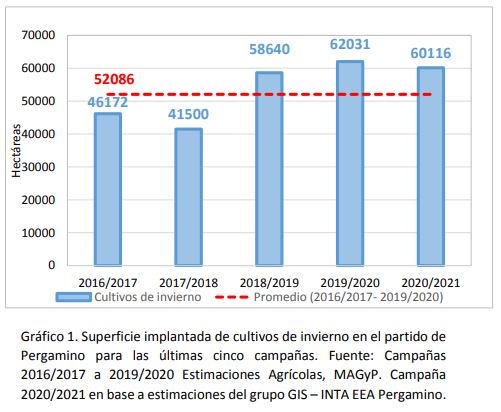 En la campaña 2020-2021 se sembraron alrededor de 60116 hectáreas de cultivos de invierno en el partido de Pergamino (gráfico 1), lo que representa un 25% de la superficie agrícola del partido.