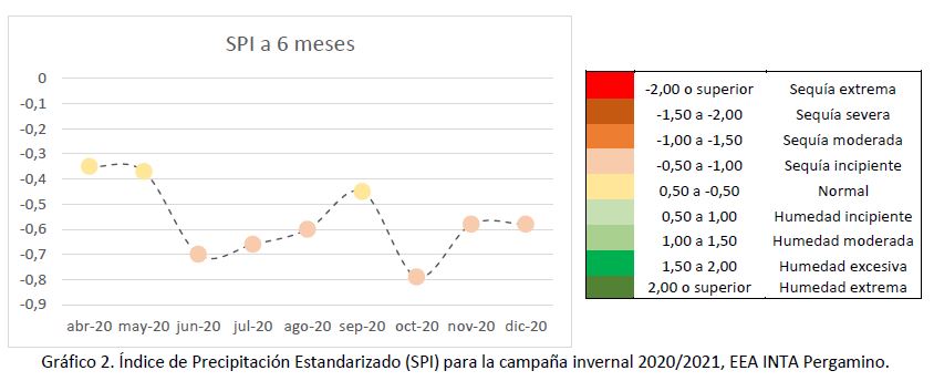 Al analizar el Índice de precipitación estandarizado (SPI)1 (gráfico 2), la totalidad de la campaña invernal se desarrolló con precipitaciones escasas. La misma se inició con registros normales, pero durante su transcurso el escenario que se mantuvo fue de sequía incipiente con alguna recuperación menor en el mes de septiembre.