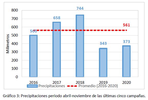 Si bien esta recuperación ayudo al desarrollo de los cultivos, las mismas fueron insuficientes como para poder revertir la situación de sequía instalada. El total acumulado durante el ciclo abril – noviembre fue de 373 mm (gráfico 3), un 67% menos que el promedio registrado en las últimas cuatro campañas. Este registro es prácticamente idéntico al de la campaña 2019/2020 con la diferencia de contar con mejores reservas de agua, en dicha campaña, a causa de mayores precipitaciones ocurridas al principio de la misma (otoño).