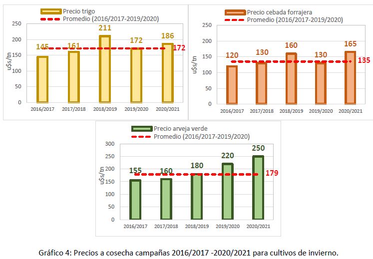 - En lo que respecta al trigo, el precio se obtuvo del Mercado a Término de Buenos Aires (http://www.matba.com.ar), mientras que para cebada forrajera y arveja verde se tomaron cotizaciones publicadas por acopiadores de la zona. Se considera el precio a cosecha en el mes de diciembre para trigo y cebada forrajera y de noviembre para arveja verde. Por lo general, estos dos últimos cultivos se siembran mediante contratos con diversas modalidades ofrecidos por compradores locales, lo que le permite al productor reducir incertidumbre de recibo y precio del producto.