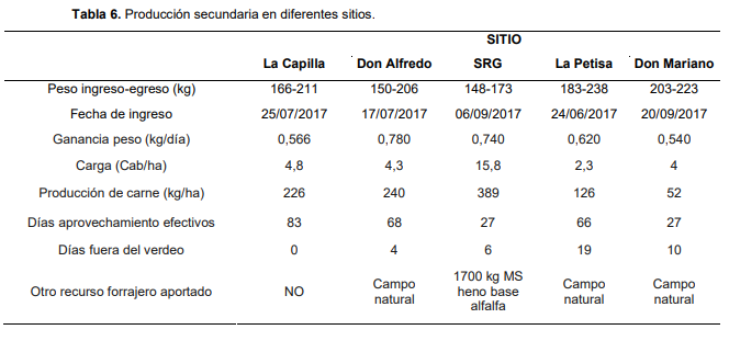 Los resultados de dos sitios mostraron productividades mayores con pastoreo y tres sin pastoreo (Tabla 5). La condición de fertilidad de los suelos, la fertilización y la fecha de siembra son factores que condicionan la productividad de los CS. En 2017, las lluvias otoñales retrasaron la siembra de los CS (Tabla 5), ello generó a su vez un retraso en el comienzo del período de aprovechamiento (Tabla 2) y la supresión del CS. De todos modos, desde el punto de vista de la acumulación hídrica para el posterior cultivo (considerando que la siembra fue en noviembre), es recomendable realizar la supresión dentro de la primera semana de octubre. Si bien hubo sitios en los que se realizó la siembra en forma temprana (La Capilla, Don Alfredo y La Petisa), las complicaciones de logística en los establecimientos, o bien la preferencia del productor de dejar un tiempo más los animales pastoreando, hizo que la fecha de supresión igualmente se retrase de la fecha considerada óptima. Tanto la producción de pasto como los días de aprovechamiento condicionaron la ganancia de peso de los animales. Así, se observaron producciones desde 80 kg/ha hasta casi 400 kg/ha de carne, siendo en promedio de 212 kg/ha en el período de aprovechamiento (Tabla 6).